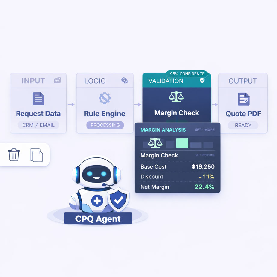 Automate complex quote-to-cash workflows. The CPQ Agent interprets requirements, applies pricing logic, and generates approval-ready quotes with built-in margin validation.