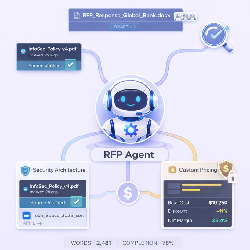 Accelerate response times without sacrificing accuracy. The RFP Agent deconstructs questionnaires, retrieves validated answers, and drafts structured responses.