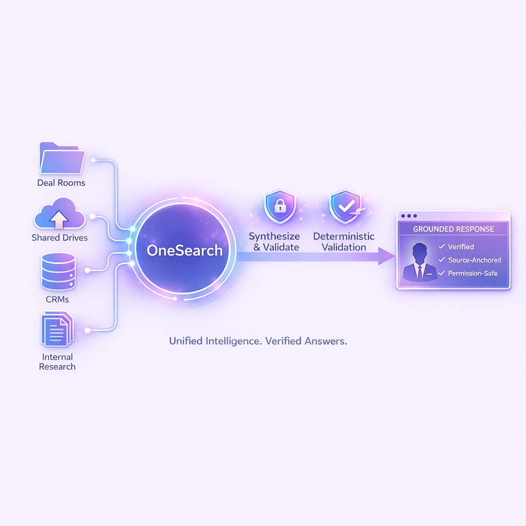 OneSearch gives associates, principals, and partners a unified intelligence layer over internal research, deals, and firm knowledge. It doesn’t return links. It synthesizes answers.